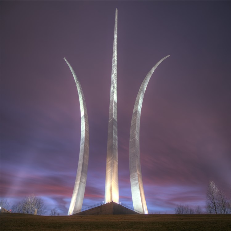Air Force Memorial – Three stainless steel spires soar skyward, evoking the image of the “bomb burst” maneuver performed by the Thunderbirds. The memorial also features a bronze Honor Guard and a contemplative glass chamber, overlooking sweeping views of DC.